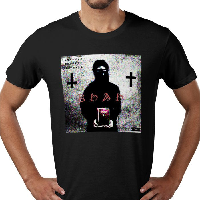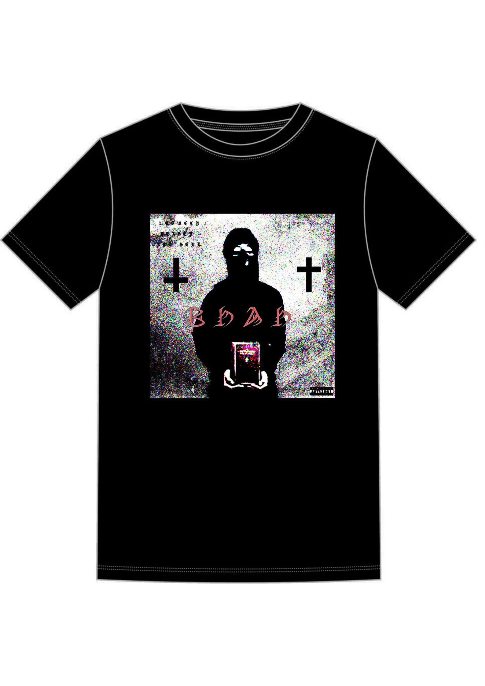 black tshirt with blank ID between heaven and hell album print on front with qr code on back (sizing fits smaller than usual) a XL feels like a large